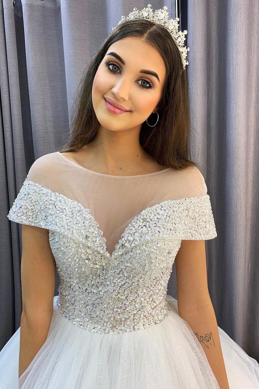 Elegant A-Line Bateau Wedding Dress with Crystal Sequins and Tulle Train