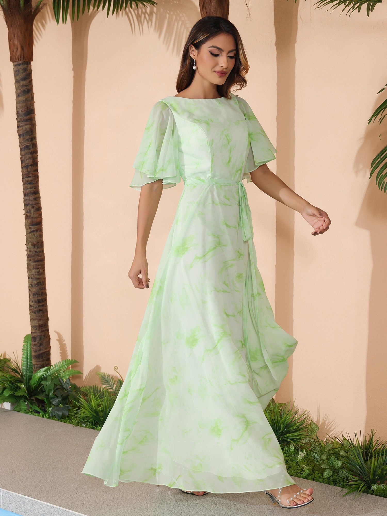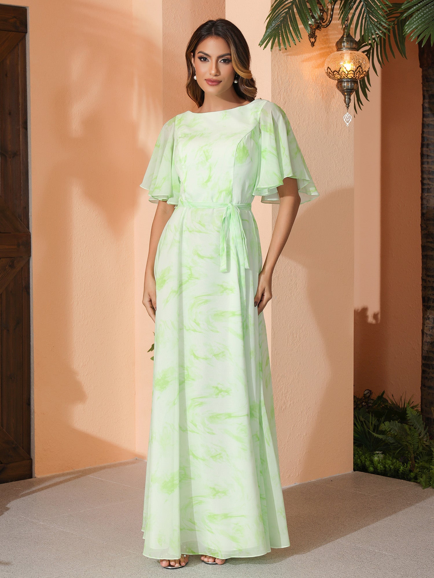 Flutter Sleeves Chiffon Max Dresses with Sash Bow Sage Dream