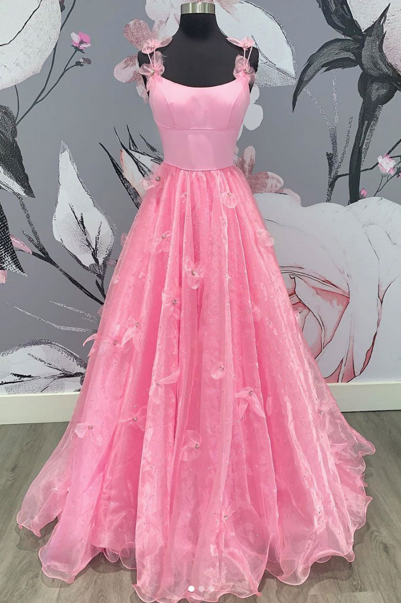 Pink tulle applique long prom dress pink formal dress