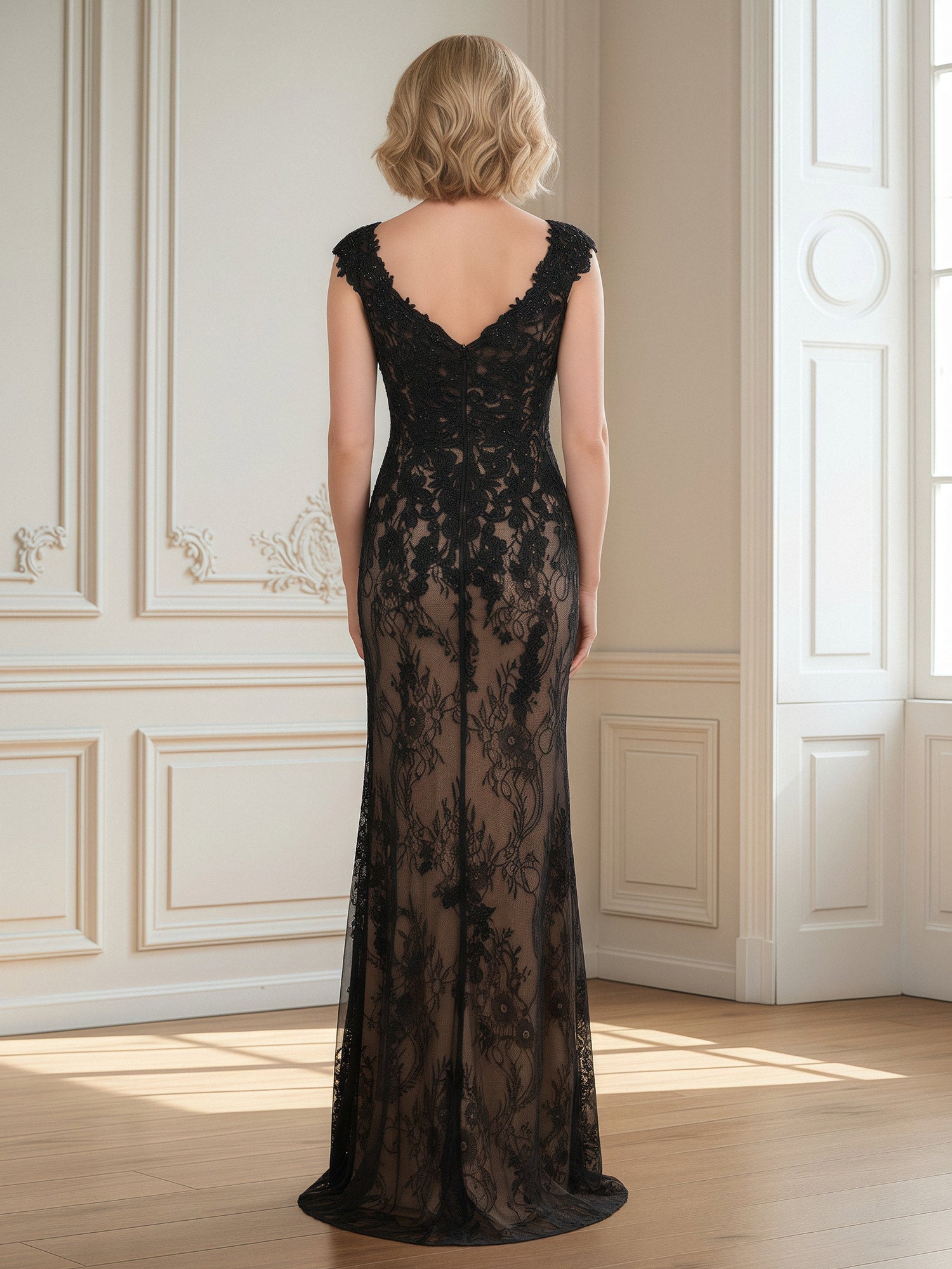 V-neck Beaded Lace Tulle Mermaid Dress With Slit Black