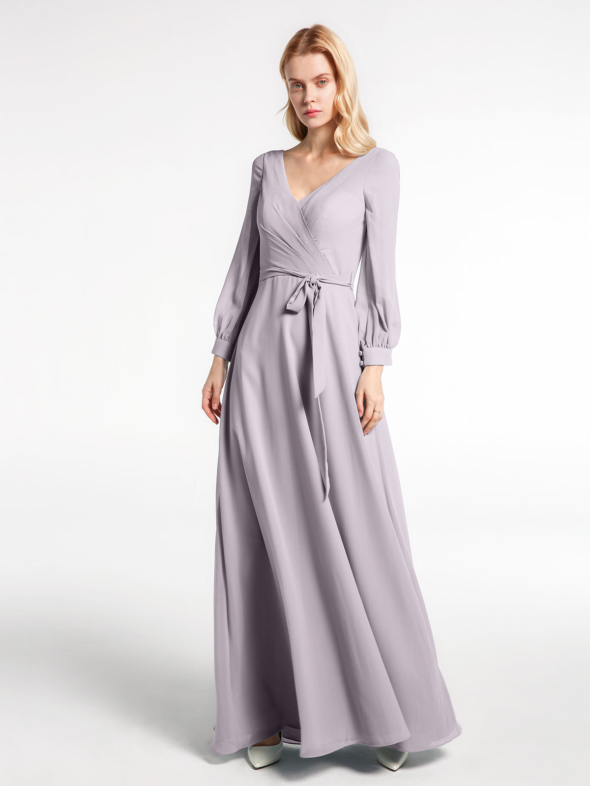 V-neck Bishop Sleeves Chiffon Dress with Bow-Dusk