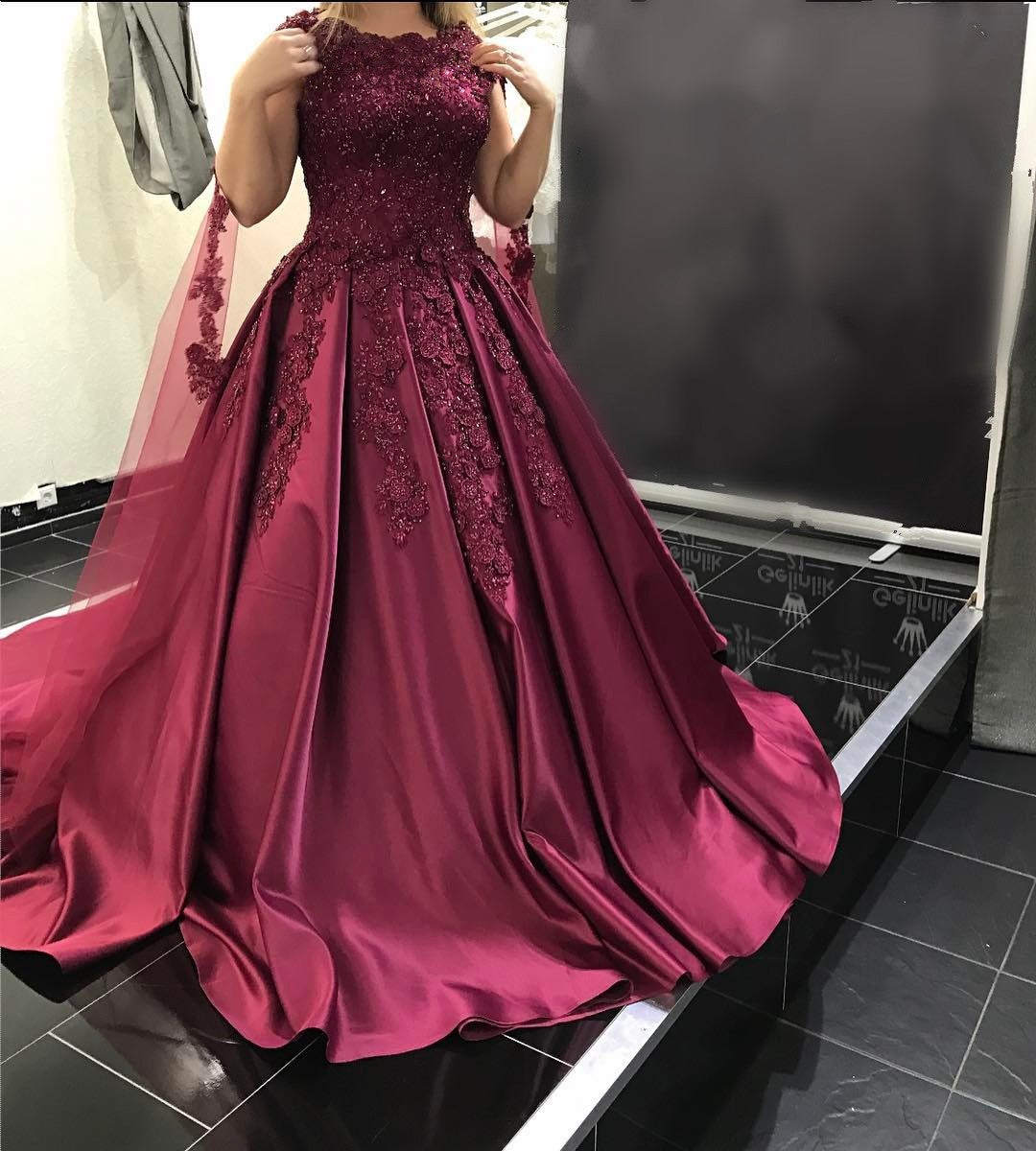 Modest Burgundy Ball Gown Satin Dress Lace Cap Sleeves